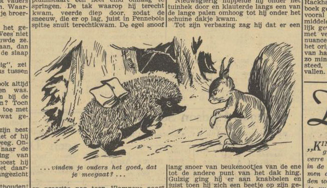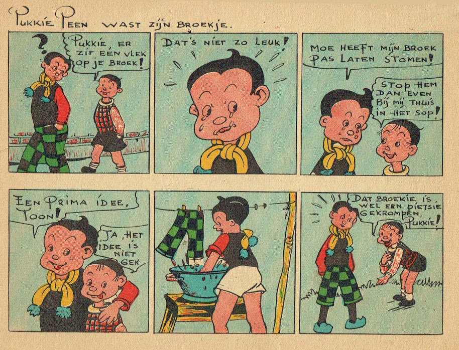 'Puckie Peen's Avonturen'. Pukkie is informed that his pants have a spot. After cleaning them, Toon informs Pukkie that his pants have shrunk "a little bit."