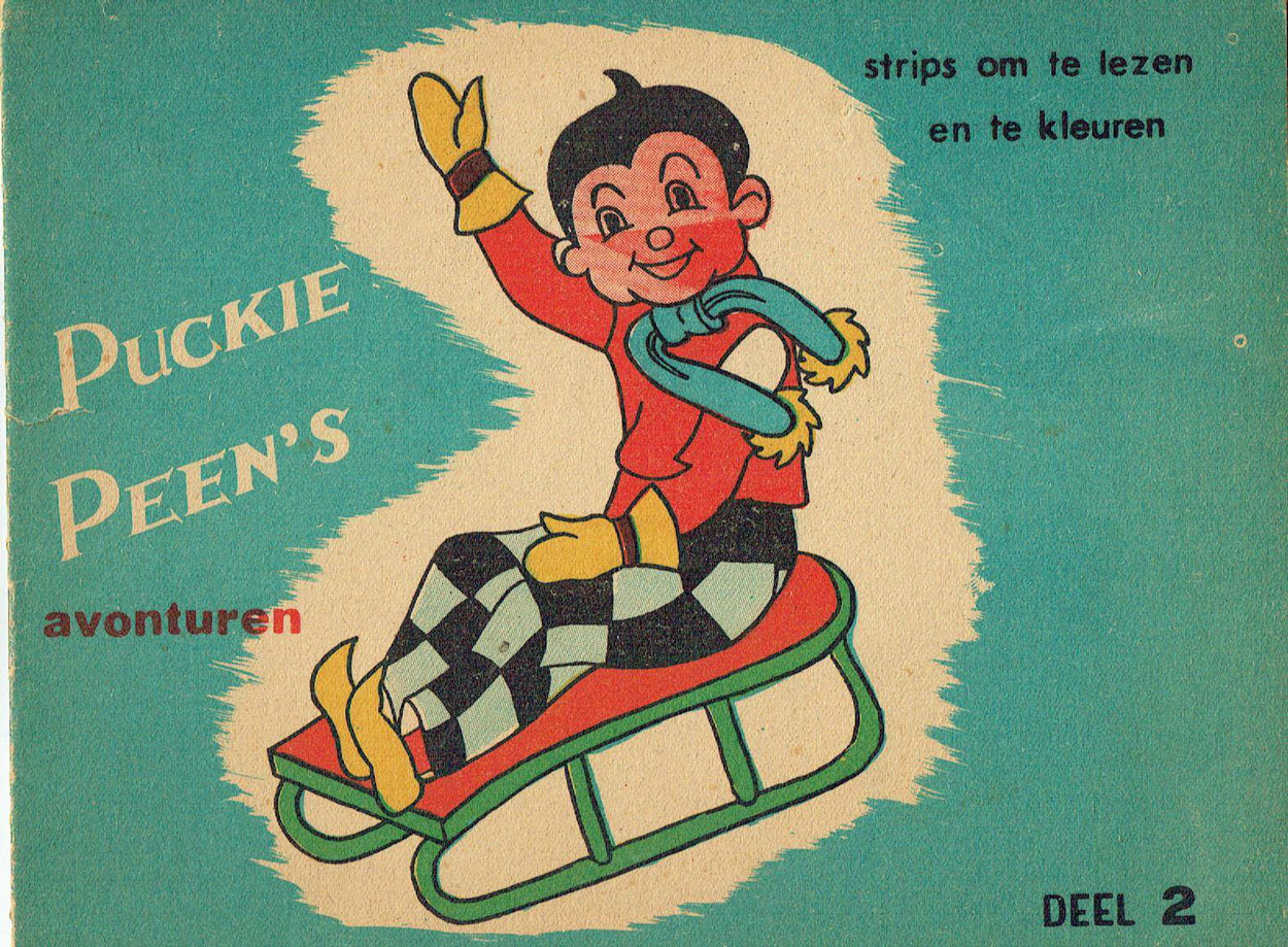 In 1952, Nelly Donker created a couple of give-away comic books for the shoe brand Matto. Six booklets in the series 'Puckie Peen's Avonturen' are known, all containing corny gags about a well-behaved but clumsy kid called Puckie Peen. Each booklet has several black-and-white pages, which the young readers could color themselves. Donker additionally drew a great many greeting and greeting cards for publishers like Roukes & Erhart and Druk Senefelder-Amsterdam, also containing cute funny animals or fairy tale scenes.