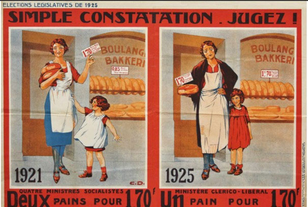Artwork for the worker's movement during the 1925 elections. The propaganda poster points out that in 1921, under "four socialist ministers", a family could afford two pieces of bread for 1.70 Belgian francs. Four years later, under a "clerical-liberal" government, the same family can only afford one bread.