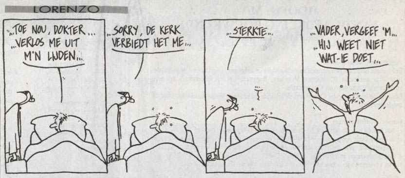 Lorenzo (De Volkskrant, 6 February 1993). "Please doctor, put me out of my misery!" "I'm sorry, the church forbids it..." "Good luck..." "Forgive him, Father, for he doesn't know what he does..."