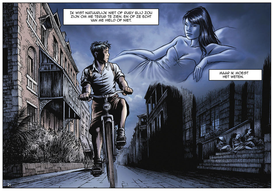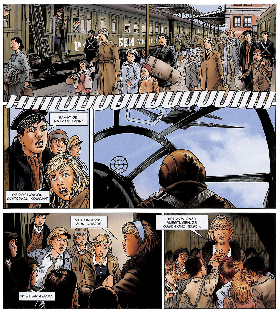 Although 'Betty & Dodge' was discontinued, Du Caju and scriptwriter Jean-Claude van Rijckeghem did join forces again to create a similar series of comic books, also set during World War II. Instead of picking recurring characters and an overall plot, most of the stories have been either one-shots or two-parters, with only their historical setting as a shared theme. Their first installment, '349 Squadron' (BD Must, 2018), was commissioned by the Belgian Air Force to commemorate their 75th anniversary in 2018. The story visualizes real-life anecdotes about airplane battles fought by the 349 Squadron during World War II. The Battle of Britain (1940) was the focus of the two-parter 'Little England' (Dupuis, 2017-2018), consisting of the installments 'Ruby' and 'Koningscobra'. Van Rijckeghem and Du Caju also delved into the little explored Battle of Stalingrad (1940-1942) with the comic 'De Muizen van Leningrad' (Dupuis, 2019-2020), a story divided in two chapters, 'Ik Ben Chapayev!' and 'De Dodenstad'. Both books were also translated in English ('The Lions of Leningrad') and French ('Les Souris de Leningrad'). In the story, Van Rijckeghem and Du Caju follow regular youngsters who get caught up in the war atrocities in England and Russia. In this regard the stories can be classified as "coming of age" tales.