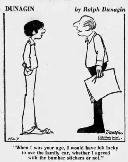 Dunagin's long-running political comic strip 'Dunagin's People' (1967-2001) originally took off under the title 'Tell It Like It Is'. In 1970, this feature also received a Sunday page, which led to the title change 'Dunagin's People'. The cartoonist poked fun at current events and politics, albeit in a gentle manner. From 1969 on, it was also in syndication through the Publishers-Hall Syndicate, and later Field Enterprises and Tribune Media Services.