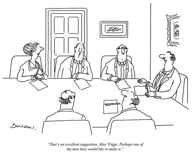 As an artist, Riana Duncan however had most impact as a cartoonist. During the 1980s, she was a regular contributor to Punch magazine, and she additionally appeared in The Spectactor, The Guardian, The Observer, Country Living and Men Only, as well as publications in Continental Europe. Recurring topics in her work were the British and their sexual relationships, prejudices and politics. A well-remembered classic has become her 1988 'Miss Triggs' cartoon from Punch magazine, in which she painfully illustrated the world's double standards with it comes to the treatment of men and women in the workplace. As the only woman in the boardroom, Miss Triggs is complimented for her excellent suggestion, after which the executive says "perhaps one of the men here would like to make it?".