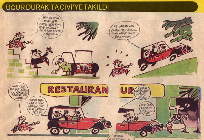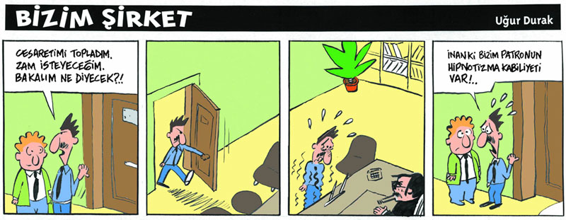 Durak has worked for many satirical magazines and he designed and edited three different ones himself, including the Turkish-German publication Biber (1984). He created many features for magazines and newspapers, such as 'Ugur Durak RakaRakaRak' on the back page of Hıbır, and the daily strips 'Mırmırlar' (for the centre-left daily newspaper Cumhuriyet) and 'Bizim Şirket' (in Gazete Habertürk since 2002).