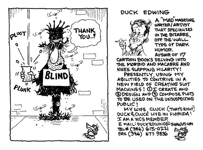 In addition, Duck Edwing invented the "Golden Gator Award", a small sculpture of an alligator, intended for the wives of cartoonists. In 1994, Edwing was also commissioned by the American Red Cross to design billboards warning drivers in case of hurricanes and giving them advice. They were planted all over Florida. In 2003, he began designing slot machines for International Game Technology, the world's largest slot machine developer. He was a member of the American Legion and the National Cartoonist Society.