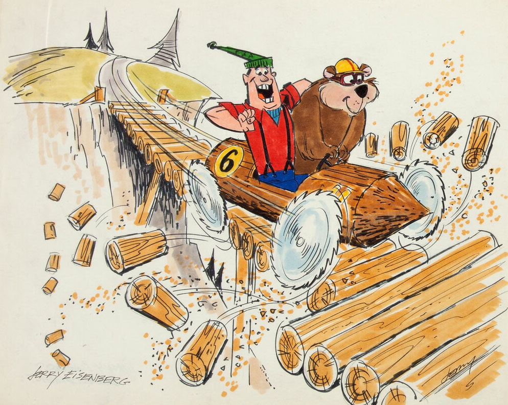 Besides his work on Hanna-Barbera's animated cartoon series, Jerry Eisenberg also participated in the artwork of the newspaper comics based on 'The Flintstones' and 'Yogi Bear', which were supervised by Gene Hazelton and distributed by the McNaught Syndicate. His father Harvey Eisenberg had been one of the early artists of the 'Flintstones' Sunday comic, but his heavy workload forced him to retire from the feature, as he was also doing the daily 'Yogi Bear' strip. Between 1961 and 1962, Jerry Eisenberg was brought in to fill in on some of the 'Flintstones' Sunday comics, and he also relieved his father on some of his 'Yogi Bear' newspaper comic work. After Harvey Eisenberg's death in mid-1965, Jerry assumed pencil duties over the 'Yogi Bear' Sunday comics until July 1969. According to the 2011 interview with the Yowpyowp blog, Eisenberg alternated work on 'Yogi Bear' with Iwao Takamoto.