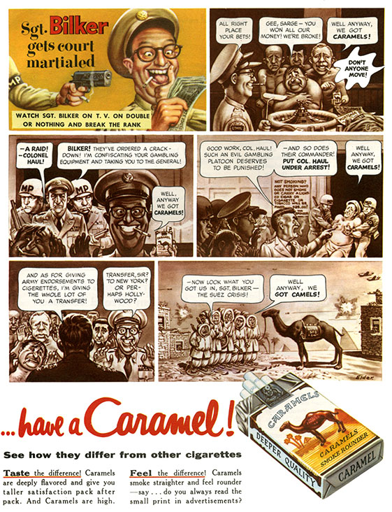 Camel advertising spoof from Trump #2, spoofing the cigarette brand 'Camel', depicting 'Sgt. Bilko' actor/comedian Phil Silvers and referencing the 1956 Suez Crisis, when Egypt closed the Suez Channel, causing economic problems and British-French-Israeli military "intervention" in Egypt.