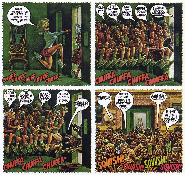 Everything is so overloaded with fun and wackiness that first-time readers don't know where to look first. One can always discover something new. Kurtzman referred to Elder's background gags as "eye-pops", while the artist himself named them "chicken fat", because, just like the real-life food, it adds extra flavor, "while too much of it might kill you." The term "chicken fat" first appeared in an Elder comic in the 'Outer Sanctum!' story, when a squeaky door opens. Elder's "chicken fat" approach was imitated by other Mad cartoonists, most notably Wallace Wood, John Severin and Jack Davis. As it became one of Mad's trademarks, later cartoonists like Mort Drucker, Al Jaffee, Angelo Torres, Tom Bunk, Sam Viviano and Tom Richmond also used it.