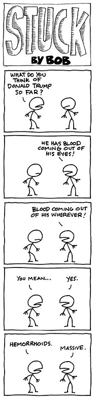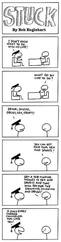 In his freelance days, Bob Englehart also submitted several ideas for weekly comic strips, which were all rejected. Out of frustration, the cartoonist created a series of vertical comic strips with simple stick figures. Much to Englehart's surprise, this concept was instantly accepted. His comic strip 'Stuck' (2015-2016) was made directly for publication on smart phone devices, and appeared irregularly. On his own website, Englehart devoted a comic strip about the development of this unusual strip, titled 'The Saga Of Another Guy Named Bob'.