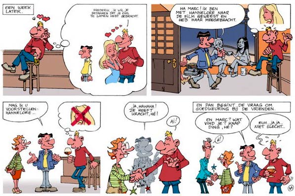 The artist who goes by just the name Evert, generally creates comics that give his view on the average guy. His stories, filled with bar talk by main character Marc and his friends, are observations of man's dealings with each other and of course women. Stories like 'Een Vrouw Met Een Plan' and 'Stijns Feestje' have been published regularly on internet comics portal Stripster since 2005 and they have appeared in print in P@per, the comics supplement of Brabant Strip Magazine.