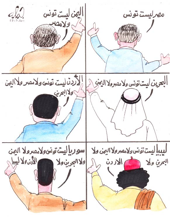 Cartoon, published on 28 March 2012. The man in the lower right corner panel is Libyan dictator Muammar Gaddafi.