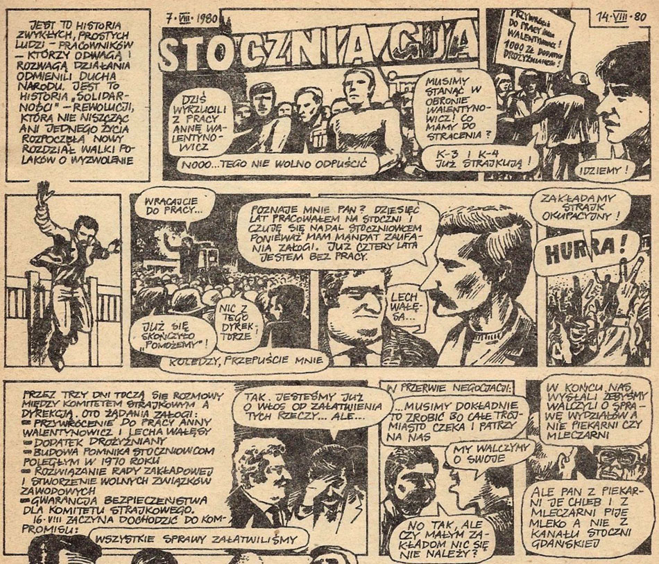 In 1984, Fedorowicz drew the first Polish underground comic book, which chronicled the first 500 days of the Solidarity movement. Created and written by Wojciech Starzynski, Andrzej Witwicki and Janowi Markowi Owsinskiemu, the 16-page story starts with the August 1980 strike at the Lenin Shipyard in Gdansk, which then spread through Poland. This led to the establishment of the first independent trade union in the Soviet Bloc which was not controlled by a communist party. The first edition of 'Solidarność- 500 pierwszych dni' was published in 1984, and a reprint appeared in 1989. By then, the "Solidarnosci" had a crucial role in the peaceful transition of the communist Poland into a parliamentary democracy. The movement's co-founder and leader Lech Walesa served as the first popularly elected President of Poland from 1990 to 1995.