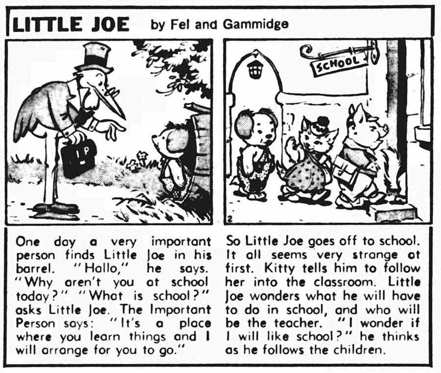 Bert Felstead was a mid-20th century British animator, illustrator and comic artist, who signed most of his work with the pseudonym "Fel". He is best-known for making funny animal picture stories for the preschool magazines of the Amalgamated Press and IPC, such as Playhour and Jack and Jill. 'Leo the Friendly Lion' (1961) was most likely Felstead's longest running feature. Along with writer Ian Gammidge he also created the children's newspaper comic 'Little Joe' (1973-1976) for The Daily Mirror.