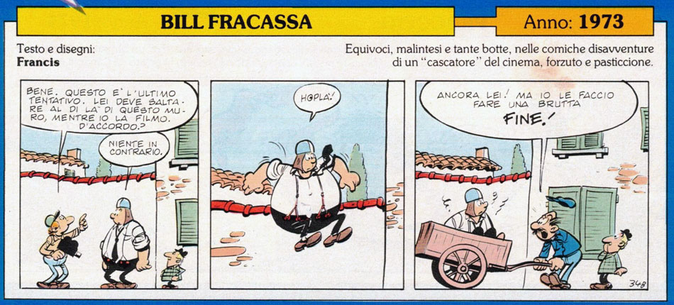 Francis Bertrand's 1970s excursions outside of Spirou magazine were either helping out friends with their workload or creating comic strips for foreign publishers. In the early 1970s, he helped Greg on a couple of stories with the kids' gang 'Les As' for Pif Gadget. By 1972, he was one of the artists working with Berck on Rolf Kauka's science fiction comic 'Mischa' (1972-1974) for the German magazine Primo. He was also present in the Italian magazine Il Giornalino with the gag series about the stuntman 'Bill Fracassa' (1973), co-created with scriptwriter Vicq. In another Italian magazine, Il Corriere dei Piccoli, 'Marc Lebut' was reprinted under the title 'Pippo Scrocca e il Ragioner Candel'. In 1976, Francis and his assistant Jean-Richard Geurts (Janry) worked on another German Kauka property, when they produced a story of the Stone Age family 'Die Pichelsteiner' for Zack Parade #16.