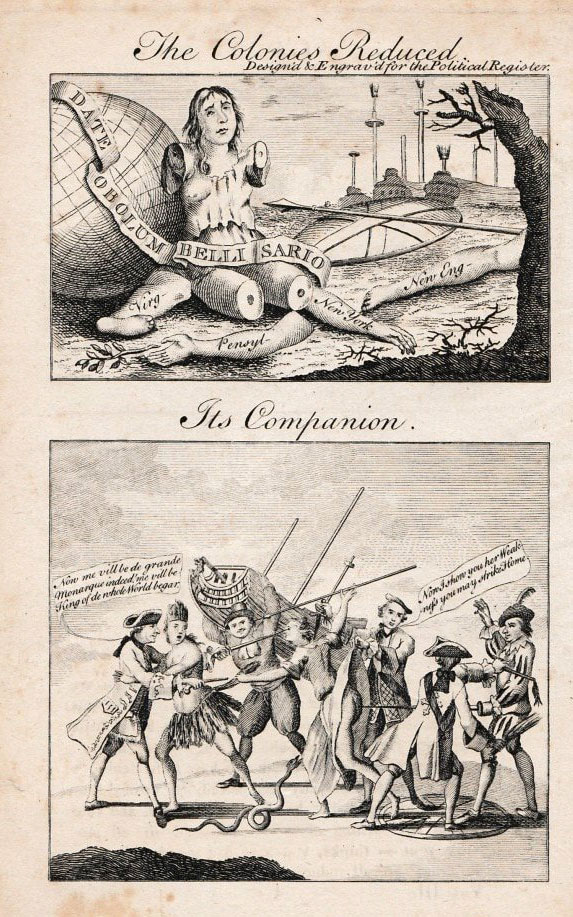 'Magna Britannia: her Colonies Reduced… Her Companion' implied that if the British government didn't listen to its people in the 13 colonies, it might lead to a rebellion, toppling the British Empire. Franklin printed the cartoon on cards and distributed it among members of Parliament. One version was printed in The Political Register of December 1768. By that date, the Stamp Act had already been repealed due to many protests. 'Magna Britannia: her Colonies Reduced… Her Companion' is notable as the first known sequential cartoon, picture story and prototypical comic made by an artist on U.S. soil (though still a decade before the United States effectively became an independent state). It also marked the first use of prototypical speech balloons in a U.S. picture story. Franklin, who was in England at the time of the cartoon's publication, was probably familiar with the developing British caricaturing industry. In 1956, editor Wilmarth S. Lewis discovered two anonymous English cartoons predating Franklin's, expressing similar metaphors, 'Britannia Dismembered and Disemboweled' (1749) and 'The English Lion Dismember'd' (1756). On both, the British national symbols Lady Britannia and the British Lion are literally subdivided by foreign forces. Still, Franklin's version is a widely different picture story in terms of imagery. As the U.S. Independence Movement grew, Franklin's cartoons, especially 'Join or Die', were endlessly reprinted. The metaphorical snake in the cartoon effectively became the national personification of the United States for a while and was copied by British cartoonists like James Gillray (for instance in his cartoon 'The American Rattle Snake', 1782).