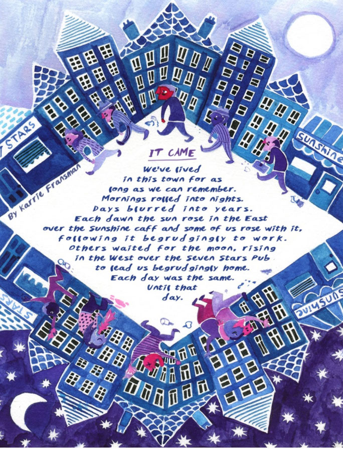 Karrie Fransman has spoken and run workshops at The Guardian Masterclasses, Tate Modern, TEDx, Central Saint Martins, Oxford University, University College London, The Hay Festival, The British Council, The Southbank Centre, The Big Draw, House of Illustration, Institut Francais, London College of Communications, ARVON, The Free Word Centre, Scottish PEN, Latitude Festival, The Institute of Contemporary Arts and The British Library, and presented her work in Spain, Belgium, Ireland, Russia, Bangladesh, Croatia, Corsica, Finland, Lebanon, France, Malta and Mexico.