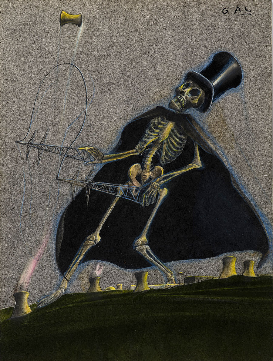 Gal's humanity and social consciousness never ended behind his drawing table. Throughout his life, he made countless posters and pamphlets for charity and human rights organizations. Among them Broederlijk Delen, Amnesty International, Oxfam, Unesco, the ICFTU (International Confederation of Free Trade Unions), the anti-nuclear missiles movement and the Anti-Apartheid movement. He actively joined public demonstrations to protest against war, poverty, unemployment, nuclear arms, nuclear testing, dictatorships, corruption, racism, colonialism, apartheid, the far right, pollution and other social injustices. In 1981, Gal published a poverty-themed cartoon in De Nieuwe, which is probably his most widespread work. The drawing depicts a common worker, whose head is the world. He despairs next to an empty wallet. The cartoon has been reprinted in countless magazines all over the world, including The Unesco Courier.