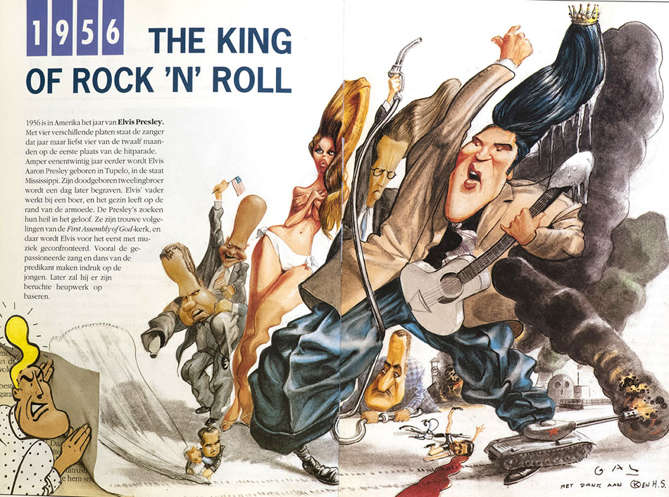 'Pré Historie' illustration for the year 1956. The cartoon visualizes several important events of that year. Rock singer Elvis Presley achieved his international breakthrough, shaking up teenagers everywhere with his sex appeal and exciting songs. His quiff has a crown, in reference to his status as "king of rock 'n' roll", while his guitar has a phallic shape. Behind Elvis, we see Belgian king Baudouin/Boudewijn, holding a gasoline syringe pressed down by Egyptian President Gamal Abdel Nasser. This references the 1956 Suez crisis, when Nasser closed down the Suez Canal, leading to worldwide oil shortage. Belgium and the Netherlands therefore organized the first of many "car-free Sundays". Next to Baudouin/Boudewijn we spot French model and actress Brigitte Bardot, who also achieved global stardom that year. Dwight Eisenhower and his running mate Richard Nixon were re-elected for a second term as respectively U.S. President and Vice-President. The bride and groom are Prince Rainier III of Monaco and Hollywood actress Grace Kelly, whose marriage was an early TV ratings hit. Beneath Elvis' legs we spot a burning coal mine, a nod to the mining disaster in the Belgian town Marcinelle, which caused over 262 deaths. Belgian cyclist Stan Ockers fell during a contest and died from his fracture. The tank refers to the Hungarian Uprising suppressed by Soviet troops. To the right, we notice the first nuclear power plant opened in a Western country, namely the United Kingdom. Finally, to the left, Kamagurka and Herr Seele's comic book character Cowboy Henk is so jealous of Elvis' quiff that he tries to turn the page.