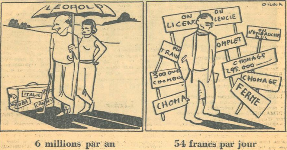 Cartoon criticizing former Belgian king and Nazi collaborator Leopold III and his second wife Lilian Baels for spending 6 million Belgian francs a year to go on a holiday, while the common unemployed man has to live on 54 francs a day.