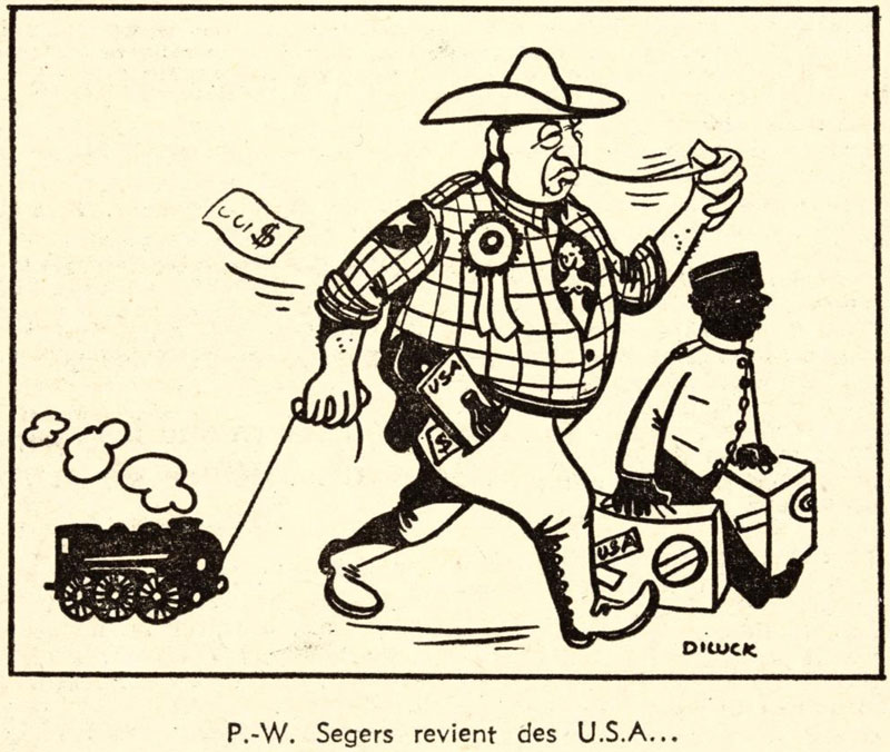 Cartoon depicting Belgian Prime Minister P. W. Segers returning from the U.S. in all his decadence (Le Drapeau Rouge, 13 January 1952).