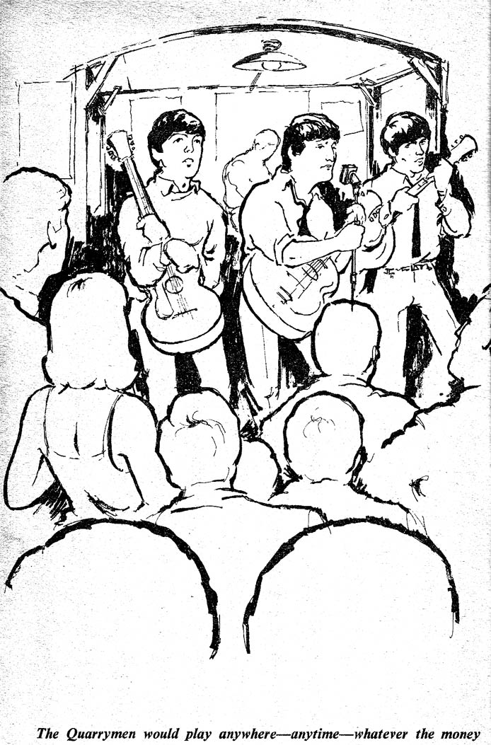 1964 drawing of The Quarrymen (the earliest incarnation of The Beatles) by Bob Gibson. From left to right we recognize George Harrison, John Lennon and Paul McCartney.