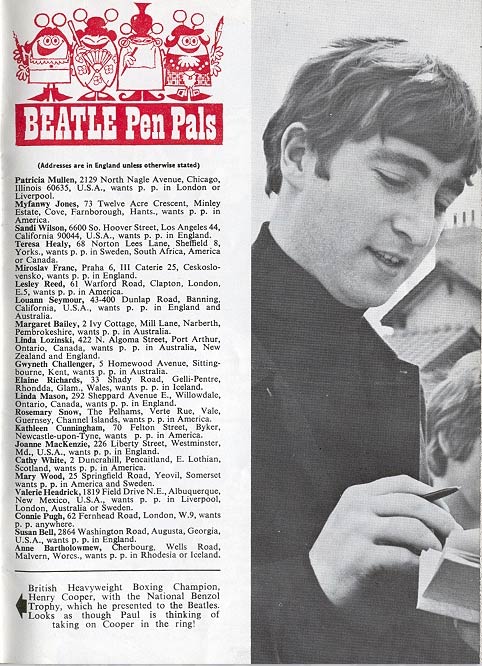 Bob Gibson was born in 1938. His career took off in 1963 when The Beatles became a national sensation in the United Kingdom. On 1 August 1963, the first issue of the official monthly fan magazine The Beatles Book was published. Gibson designed its white-lettered logo and the headings of the publication's columns. Among them were the readers' sections, 'Letters from Beatle People' and 'Beatle Pen Pals', and background information about the group in 'Beatle News', 'Behind the Spotlight' and 'This Month's Beatle Song'. When the Fab Four's rivals The Rolling Stones broke through, Gibson also became house cartoonist for their fanzine, The Rolling Stones Monthly.