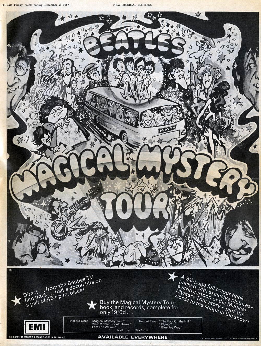 While 'Magical Mystery Tour' was badly received at the time, its soundtrack album was nevertheless an international bestseller. It contains hit singles like 'Magical Mystery Tour', 'The Fool on the Hill', 'I Am the Walrus', 'Strawberry Fields Forever', 'Penny Lane', 'Hello Goodbye' and 'All You Need Is Love'. Inside the record sleeve, caricatures of The Beatles could be found, drawn by Bob Gibson. He also added a 6-page comic strip adaptation of the movie, drawn in a text comics format with the dialogue written beneath the images. Gibson additionally created an advertisement page for the album, published in New Musical Express.