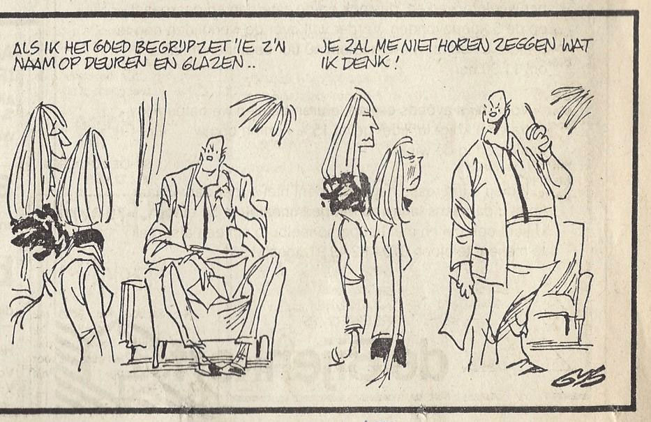 Later in life, Gijsbers was an editorial cartoonist for other newspapers and magazines. In the 1970s and 1980s, his satirical political drawings notably appeared in opinion magazine Elsevier and the newspaper Haagsche Courant. In 1975, the latter also ran his untitled comic strip about the generation gap between a teenage daughter and her old-fashioned father, a feature obviously inspired by Peter van Straaten's comic strip 'Vader en Zoon' (1968-1987) in Het Parool. Sports cartoons by Gijsbers appeared in the magazines Sport Intermedium (1980-1984) and Nationaal Sport Magazine (1985-1989).