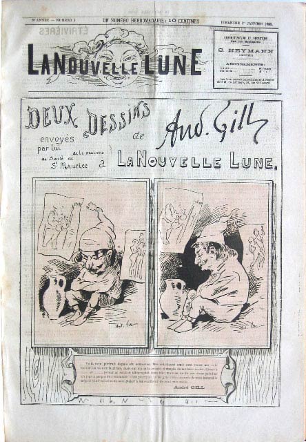 While Gill is first and foremost remembered as a caricaturist, he also made a contribution to comic history with a six-panel text comic named 'L' Amateur de Violon: Étude Musicale' ('The Amateur Violinist. Musical Study', 1866), which was published in La Lune. The story depicts a violinist who gets drunk and is eventually thrown in jail. Each moment of his low-life behavior is accompanied by sarcastic descriptions in the style of a violin movement, with the first image being called '1st Étude' and so on. In 1882 Gill drew 'Deux Dessins' for the cover of La Nouvelle Lune, which portrayed the artist himself sleeping in his studio. The images are shown in two sequences, one showing him from the front, the other from the side. In 1883 he made a cover for La Nouvelle Lune titled 'Nouveaux Coquis', which depicts three images of his face with a date written underneath them. The first two are simple line drawings, while the third one is a more sketched out self-portrait. While not a comic strip they can still be read as a thematic series of sequences.