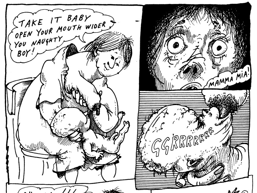 Fisher gave a lot of interviews to defend his freedom of speech. At the same time, he and his company were subjects of severe demonization in the press, court cases, death threats, protest marches, attackers, stalkers and vandalism. Embracing his new status as "most dangerous man in U.S. comics", Fisher released even more comic books based on real-life crime cases and controversial media figures. To add fuel to the fire, he brought out three additional comic books about Dahmer. Compared to Hanford's comic, these new titles were all far more shocking, tasteless and silly. Eric Gnoeff received the honor of drawing the very first of these black comedy comic books, 'The Further Adventures of Young Jeffy Dahmer' (October 1992). Scripted by Fisher, with a cover design by Everett Hartsoe, the comic focuses on Dahmer's supposed childhood. He is born as a despicably ugly brat in an absolutely depraved hospital. Together with his childhood friend Dan Quayle (referencing U.S. Vice President Dan Quayle), he terrorizes his neighborhood. Halfway through the story George Bush Sr. and Bill Clinton also have a random cameo, since the publication of Gnoeff's book coincided with the 1992 presidential elections. However, here the politicians turn out to be filthy child molesters.