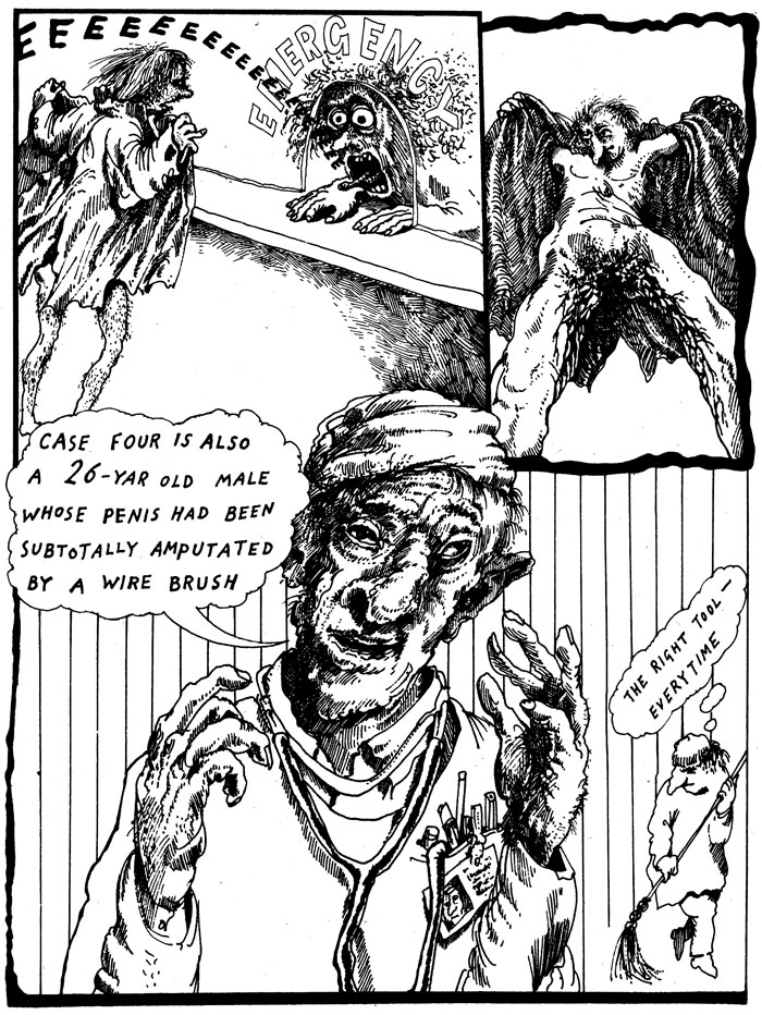 In his foreword, Fisher writes that he first met Eric Gnoeff in 1989 in the corner of his etching studio at the University of Illinois. Fisher further described his work: "On this man's walls were some of the most disturbing pieces of artwork I had ever seen. Some of those pieces have desecrated the back cover of Dark Angel, our flagship title. Not only was this guy a warped bastard, but his work showed incredible talent. I have never met a finer artist. Naturally I began to pester him for a book." Possibly to warm up the audience to the comic book's raunchy content, Fisher continued his editorial with: "It wasn't until he was acquitted of some mutilation/rape cases in Wisconsin, that he was able to do any work for me. It was definitely worth the wait, prison must have really inspired him on this one."