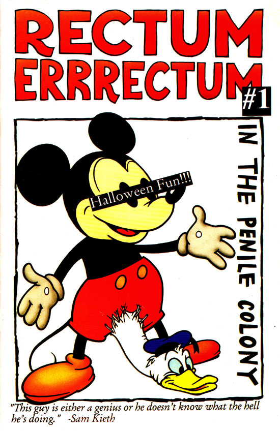 The cover of 'Rectum Errrectum' features a quote by comic artist Sam Kieth, which summarizes the Gnoeff's creation brilliantly: "This guy is either a genius or he doesn't know what the hell he's doing." The cover of the October 1992 release depicted Walt Disney's Mickey Mouse, with Donald Duck's elongated neck sticking out of his pants. In his foreword, Hart D. Fisher, explained why he decided to offend the Disney Corporation: “A lot of people are wondering why I’m bothering to bump dicks with one of the biggest, most rabid entertainment industries in America - over a book that doesn’t make money. It’s because I respect Eric’s integrity as an artist. His freedom to create unimpeded by small minds.”