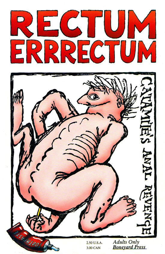 In October 1991, Boneyard released Eric Gnoeff's 'Rectum Errrectum: Catamite's Anal Revenge''. This strange crime thriller centers on a deviant, Pedro, who creates havoc in the homosexual community. He sneaks up to unsuspecting men and cuts off their genitalia, leaving a bloody mess behind. A police officer goes undercover to investigate the matter. In December 1991, 'Rectum Errrectum' was re-released as 'Rectum Errrectum: In The Penile Colony', with the first half of the book a reprint of 'Catamite's Anal Revenge', and the second half a brand new story. In this sequel, Pedro the penis mutilator is still at large. He sells his cut-off genitals to a group of feminists. With help from a voodoo queen, they attach the penises to voodoo dolls, so they can destroy as many men's private parts as possible.