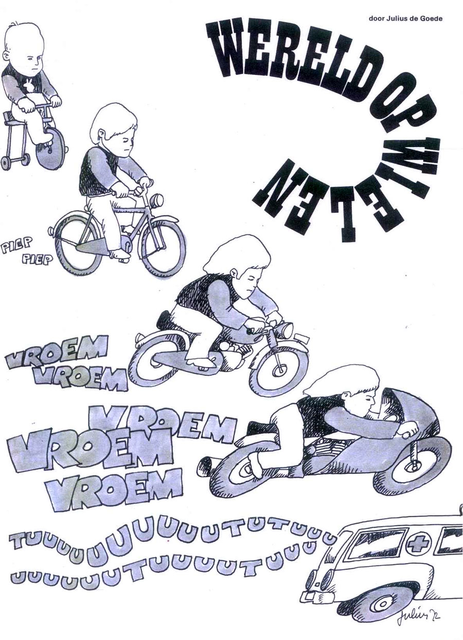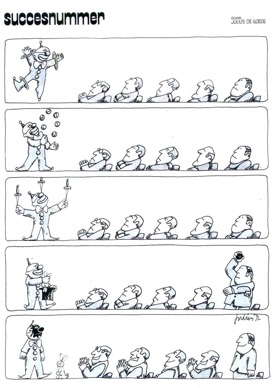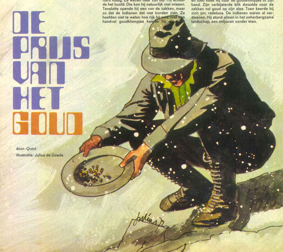 By the late 1960s, Julius de Goede had already showcased his interest in comics. In 1967, he appeared in issue #21 of the Dutch edition of Mad Magazine with 'Erik de Viking, door Hans G. Krusse', a three-page spoof on Hans G. Kresse's 'Eric de Noorman' comic. His further excursions into creating comics himself were three one-shot gag pages in the section 'Pep Spotter' in Pep magazine, one in 1970, two in 1973. Later in his career, in 2004, De Goede contributed another comic story to the third issue of the Utrecht comic magazine De Inktpot.