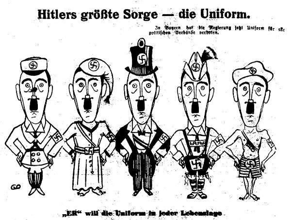 Cartoon by Erich Gold, mocking Hitler's policies regarding uniforms.