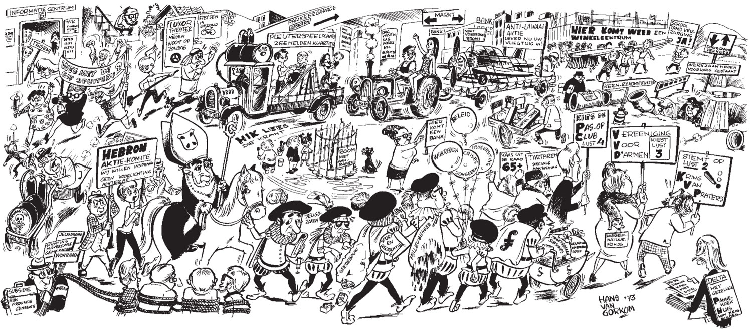 Drawing for the 6 December 1973 issue of HIK, showing the social issues in Hilversum that season.
