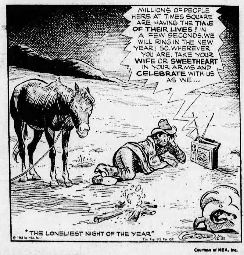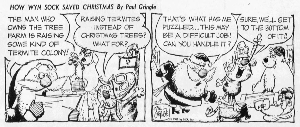 In 1969, Gringle was additionally tasked to provide the NEA syndicate's December feature, this time called 'How Wyn Sock Saved Christmas'. It ran from 1 through 24 December. In the late 1960s he also made a single panel western cartoon called 'Rip O'Hare' for the syndicate. Later features by Paul Gringle include 'Park Ave.' (1972), 'Kookie the Cook' (1981-1982) and 'Witty World'.