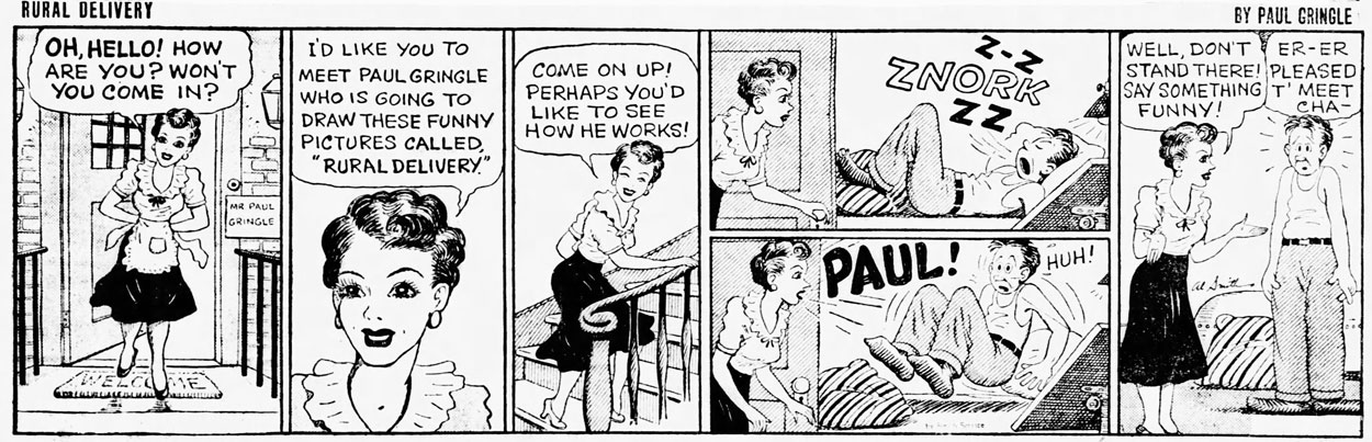 On 4 January 1951, readers of local newspapers like The Plattsmouth Journal were introduced to a new set of six comic strips distributed by the Al Smith Service. Besides Al Smith's own 'Jackie', the new comics were 'Deems' by Tom Okamoto, 'Off Main Street' by Joe Dennett, 'Those Were The Days' by Arthur Beeman, 'Going West' by Frank Thomas and a family comic called 'Rural Delivery' by Paul Gringle. In the first 'Rural Delivery' strip, a pretty housewife introduces the readers to the man who will draw "these funny pictures", only to find Paul Gringle asleep at his drawing table. Strangely enough, this first strip was signed by syndicate chief Al Smith.