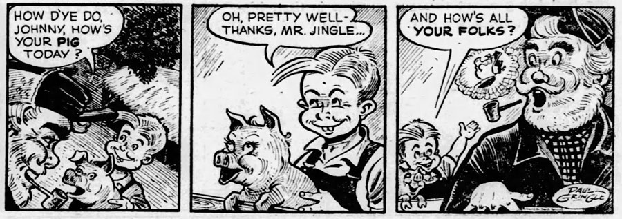 The main star of 'Rural Delivery' is a pretty country girl called Jenny, who lives with her "Ma and Pa" in Snow Falls County. The comic was obviously inspired by the success of Al Capp's 'Li'l Abner', from the hillbilly setting and graphic look to several of the cast members. However, while Capp's series featured clever satire, 'Rural Delivery' is a straightforward gag-a-day comic. The focus of the later episodes seems to shift towards Jenny's father, the mailman Mr. Jingle. By October 1951, Gringle's strip apparently disappeared from the comics section. Despite his short tenure on it, Gringle felt personally connected to his strip. In an interview with the Arizona Republic of 2 August 1976, the artist revealed that he got most of the ideas while listening to soap operas on his grandmother's radio. At one point, he said, he got so involved in the main character (the postman), that he began to believe he was him. 'Rural Delivery' was later continued by Al Smith, who combined it with his own strip about the black kid Jackie (first found strip dates 16 April 1953). Smith's version ran well into the 1980s, although most of the original cast had disappeared by then.