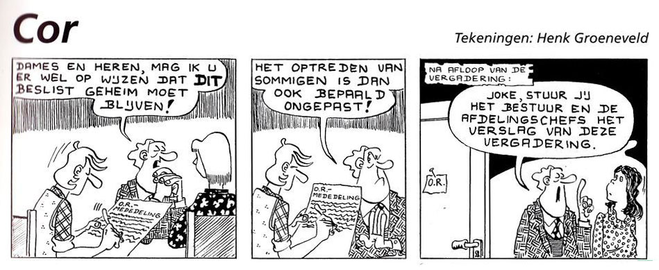 Another long-running comic strip by Henk Groeneveld was 'Cor', which appeared in Praktijkblad voor Medezeggenschap and later in Ondernemings Raad, specialized magazines for works councils. Together with writer Hugo Klooster, Groeneveld created the comic book 'Cor in Strip' (Welboom, 1980), containing 60 copyright-free comic strips, free to use in annual reports and other publications of works councils. Groeneveld's 'Cor' strips have appeared in Ondernemings Raad well into the 21st century.