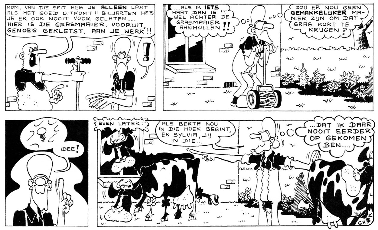 Henk Groeneveld was born in 1946 in Vlaardingen, Zuid-Holland. Contrary to what one would expect, he wasn't born on a farm, nor had any agrarian background. As a child, he developed a keen passion for drawing, fuelled by Frans Piët's 'Sjors en Sjimmie' stories, and the weekly comic magazines Donald Duck and Pep. In an interview with Stripschrift (#419, November 2011), he particularly mentioned the French comic 'Sylvia' by Martial as an early inspiration. However, Groeneveld moved on to study cultural anthropology, with a strong passion for Polynesia, and graduated in 1973. By then, he was however already working steadily as a cartoonist for magazines and pamphlets published by trade unions, as well as educational, health care and youth care organizations. During his professional life, he lived and worked in Utrecht.