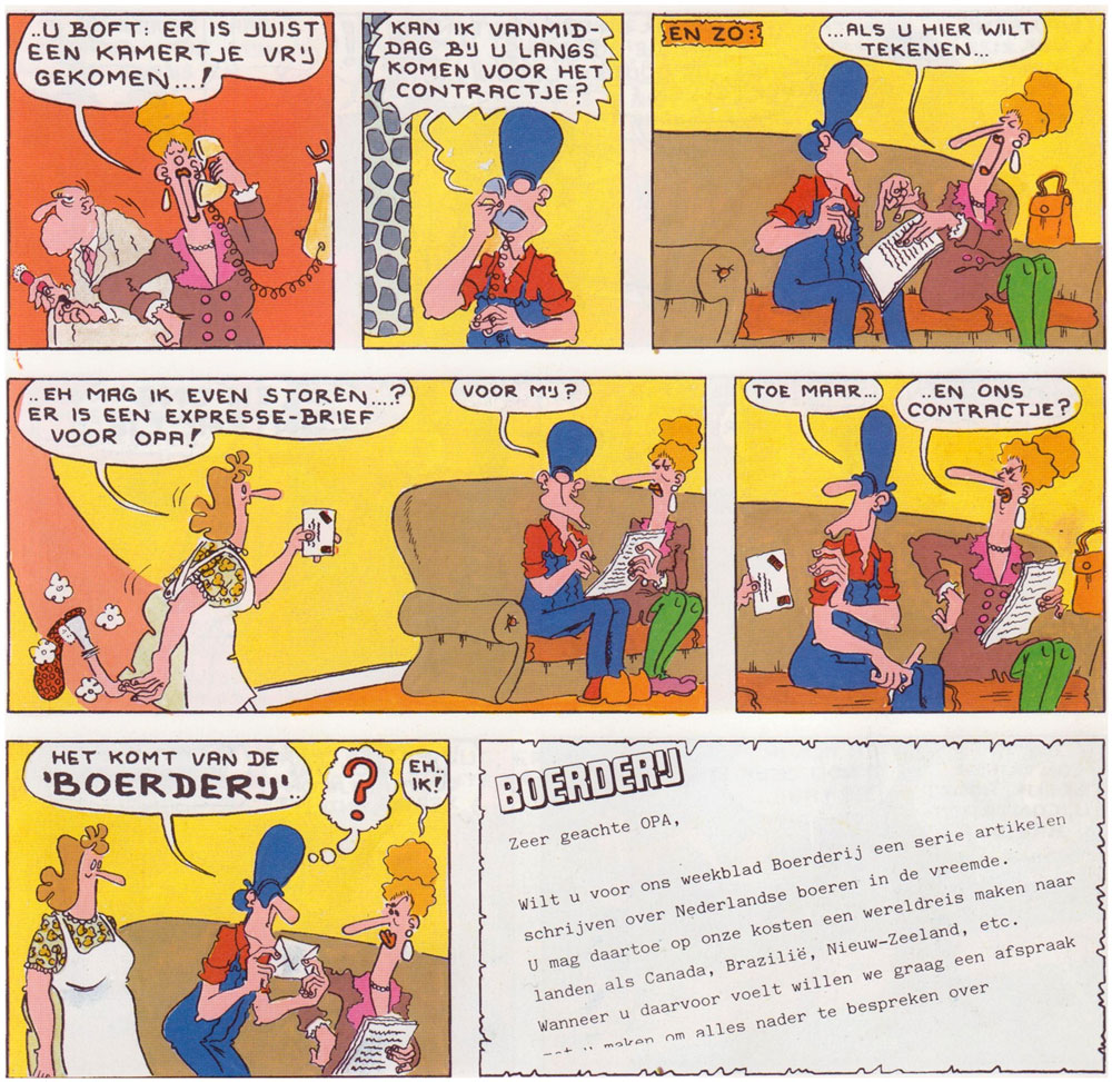 'Opa' was printed on the back page of each issue and quickly became popular with readers. Several of his antics were collected in books, published since 1976 by C. Misset and, from 2004 on, by Reed Business Information. A notable book release was 'Opa bij de Emigranten' (1986), a full-length story with the character, published in color. The feature has also spawned merchandising, like overalls, farm equipment, mugs, playing cards, shirts and truck decoration figurines. Groeneveld drew 'Opa' for more than 33 years. Despite the thematic gimmick, he never ran out of ideas. His editors only complained if Opa hadn't been seen on his farm for a few episodes. At a certain point, Groeneveld was even told to no longer let Opa go on wintersport holidays or spend so much time in bars.