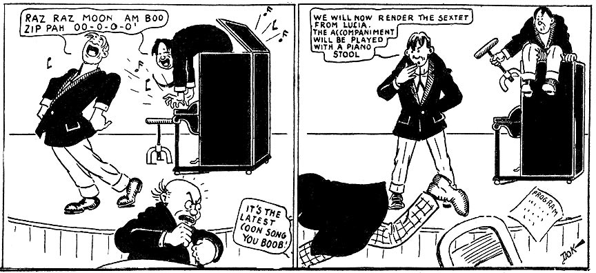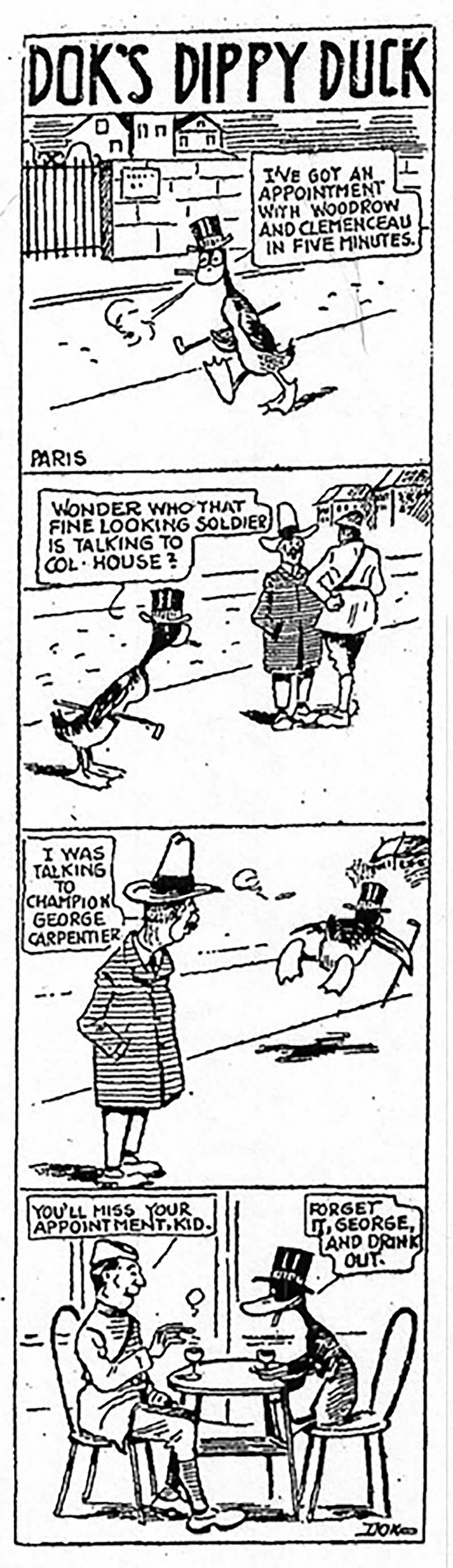 On 31 May 1912, the bird already had its own spin-off strip, initially nameless, but eventually called 'The Duck. By Dok'. By February 1915, it had evolved into a gag-a-day comic under the title 'Dok's Dippy Duck'. In four to seven panels, the duck commented on the daily news, most notably the ongoing First World War. Several episodes took place in Europe, where Dippy mets with French leader Georges Clemenceau and U.S. President Woodrow Wilson at the 1919 Paris Peace Conference, as well as the French boxing champion Georges Carpentier. In the duck's conversations with women, Hager dared to include some risqué conversation for the time, for instance in an April 1919 episode in which Dippy comments on a woman's silk stockings.