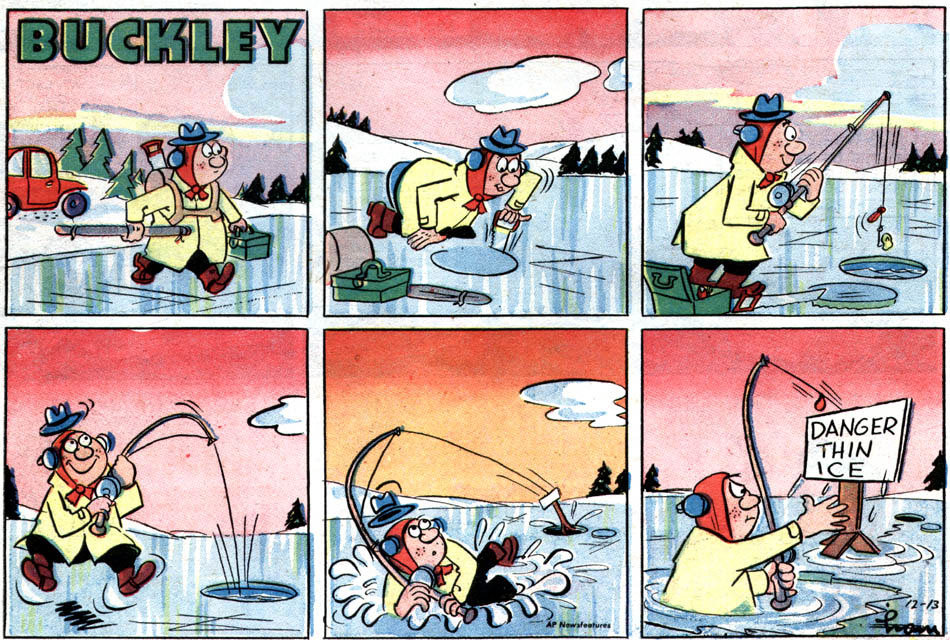 Back home, Cunningham returned to the Associated Press. A broken leg after a football accident made him decide to turn to full-time cartooning. It resulted in his daily cartoon panel 'Hit 'n' Run', which went into circulation on 6 January 1947. A Sunday comic was added on 26 January, and the daily switched to a two-column format on 8 August 1949. In the previously mentioned interview, Cunningham stated he created the feature to "spoof the human menagerie and most of the animals." 'Hit 'n' Run' had a whimsical, lightweight sense of humor, often inspired by the cartoonist's own life. The feature was retitled to 'Slice of Ham' on 2 October 1950, after the cartoonist's signature: "Ham". The title changed once again on 13 April 1953, this time to 'Buckley', after the feature's recurring character. 'Buckley' was in circulation until 1961. The Sunday comic had already disappeared in 1955.