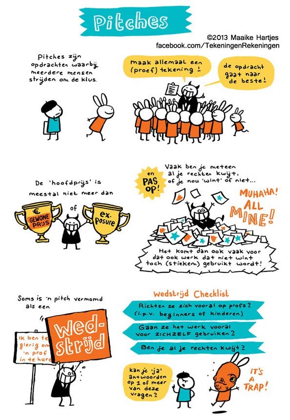 In addition to her comics, Hartjes provides commercial assignments through Hans Buying's Comic House agency. She makes illustrations in all sorts of styles, and is for hire as a live cartoonist at business events. She has participated in collective projects like 'Strips in Stereo' (2006) and 'Mooi Is Dat!' (2010), to which she contributed comics interpretations of the Boudewijn de Groot song 'De Kinderballade' and Paul van Ostaijen's poem 'Boem Paukeslag!', respectively. Between 2004 and 2006, she wrote the scripts for the comic strip 'Siglo XXV', drawn by Ben Westervoorde and published on the back page of National Geographic Junior.