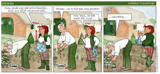 'Roos'. Translation: "Say, pick some more beans. My sister is staying over to eat tonight." - "Again... she has been here recently!" - "Listen.. I only have one sister..." - "That's a relief...".