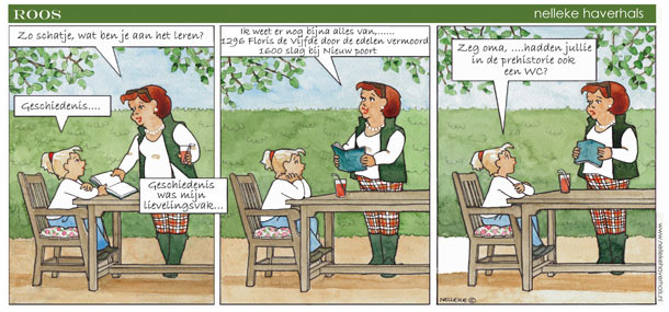 'Roos'. Translation: "So, my dear, what are you learning?" - "History..." - "History was my favorite subject... I still remember everyhing. 1296: Floris V murdered by noblemen. 1600: Battle of Nieuwpoort..." - "Say, grandma, did you have a toilet in prehistoric times?"