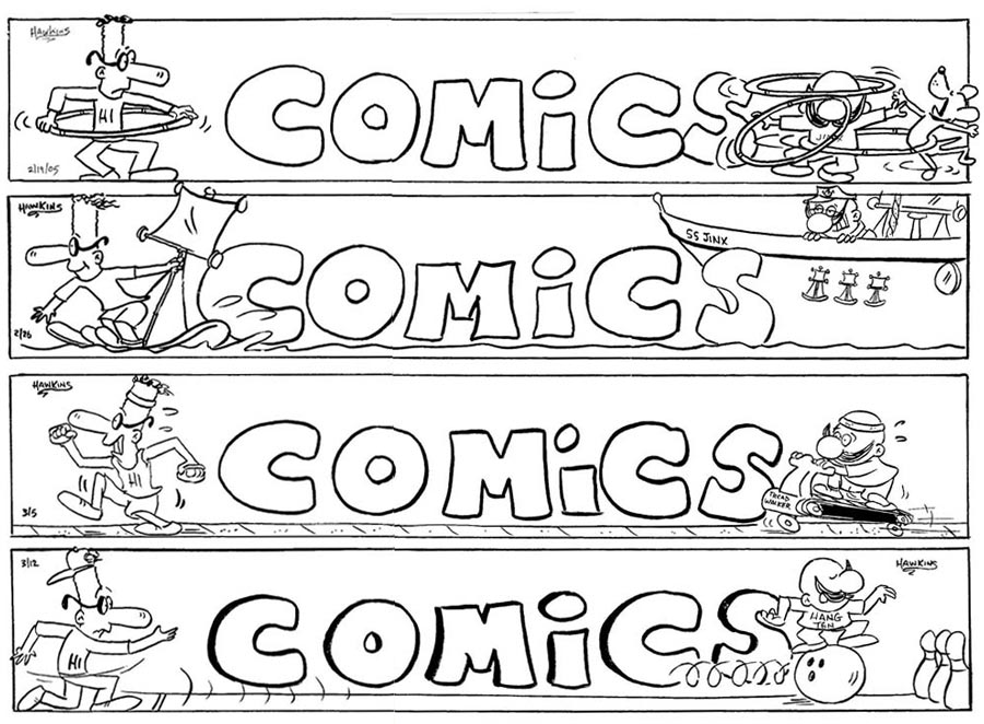 Hawkins' rural-themed single panel cartoon feature about a group of farm animals, 'Country Chuckles', appears in dozens of publications including Farmer's Exchange, Country Folks Magazine, Hometown Gazette and GraiNews. In 1993, he succeeded the late Malcolm Hancock on the masthead comic 'Hi and Jinx' through Davy Associates for another 13 years. The two characters, Hi and Jinx, experienced pantomime gags around the letters of the Sunday comics sections in newspapers such as The San Antonio Express-News, Milwaukee Journal and The Salt Lake Tribune. Besides print products, Hawkins' cartoons have been licensed and sold on CD's, framed art, T-shirts, hats, magnets, mugs, bookmarks, greeting cards, napkins and even wine toppers.