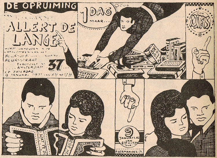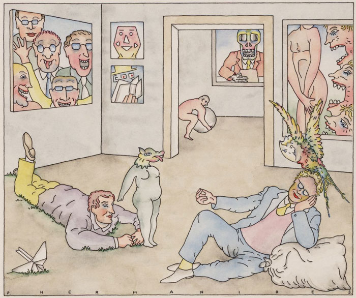 His cartoons and comic strips appeared in several cultural magazines of the 1960s and 1970s, ranging from Avenue Literair (supplement of the glossy magazine Avenue) to the alternative papers Hitweek and Aloha. Between 1968 and 1974, he additionally contributed to Delta, a "review of arts, life and thought in the Netherlands", and the literary magazine Soma. Later in the 1970s, he also contributed to Hollands Maandblad and newspaper Trouw. According to a 1974 overview catalog of Dutch comic artists, his story 'De Draak van Bociti' was published in a comic book, but no further information about this particular publication is known. In 1972, artwork by Hermanides was part of the 'Van De Beesten Af' exhibition of contemporary art, and featured in the accompanying catalog. During the late 1980s, he made the slightly absurd illustrations for the philosophical column 'Humeuren en temperamenten' by Dutch poet Gerrit Komrij in Vrij Nederland magazine. His mix of surrealist narratives and the Clear Line drawing style reminds of the work of Glen Baxter and the Dutch outsider cartoonist Mark Smeets. Notable examples are his refined, allegorical drawings about Arti et Amicitiae in 1989, in which he portrayed the judging, opening and furnishing of the Salon in a comical way.