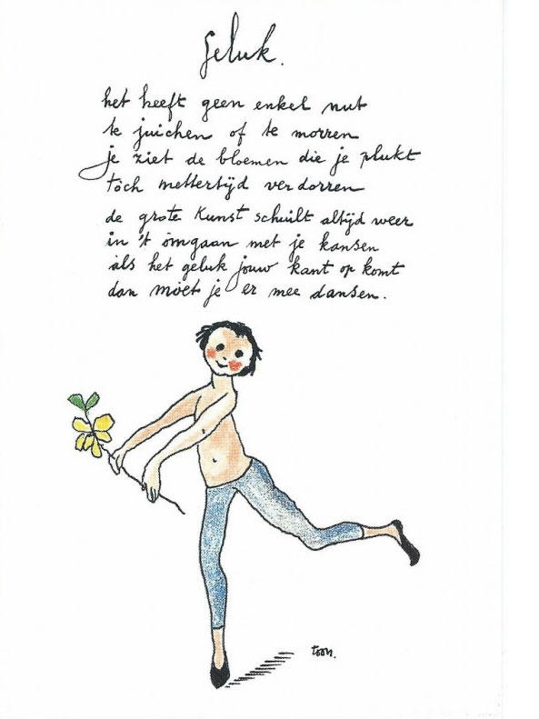 In his spare time, Hermans wrote short poems, which he dubbed his “verses”. They are typically simple reflections on life, mankind, nature, happiness or the benefits of being nice to each other. Some were only a few lines long. The comedian used them during his stage shows, but they were also printed on greeting cards, calendars and tiles. Hermans also made them public in books, and to liven up the pages he often added personally drawn cartoons. All were simple line drawings, close to doodles, which visualized the themes of his poetry. Hermans' artwork appeared in his books 'Kladboek' (1953), 'Waar Ben Je?' (1980), 'Vandaag Is De Dag' (1987), 'Verzamelde Versjes' (1989), 'Geluk' (1990), 'Liefde' (1990), 'Een Boom Opzetten' (1995) and 'Wijsheid en Andere Versjes'. Some of his books were made with the participation of his cartoonist friend Ted Schaap, AKA Scapa, who also designed some of his theatrical posters.